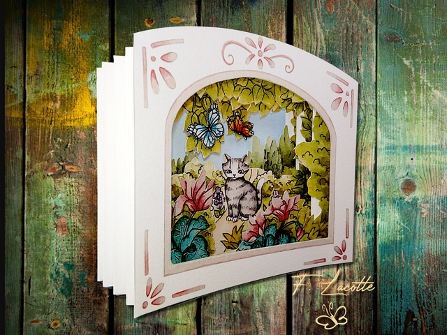 Carte tunnel à effet pop-up ( = effet 3D), mettant en scène un petit chat gris au cœur d'un paysage agrémenté de cyclamens et de papillons. Cette carte est composée de 5 couches décorées et reliées entre elles par des charnières accordéon, offrant ainsi un effet de profondeur original. Chacun des décors dont elle est constituée a d’abord été conçu, dessiné puis peint à l’aquarelle avant d’être imprimé.
